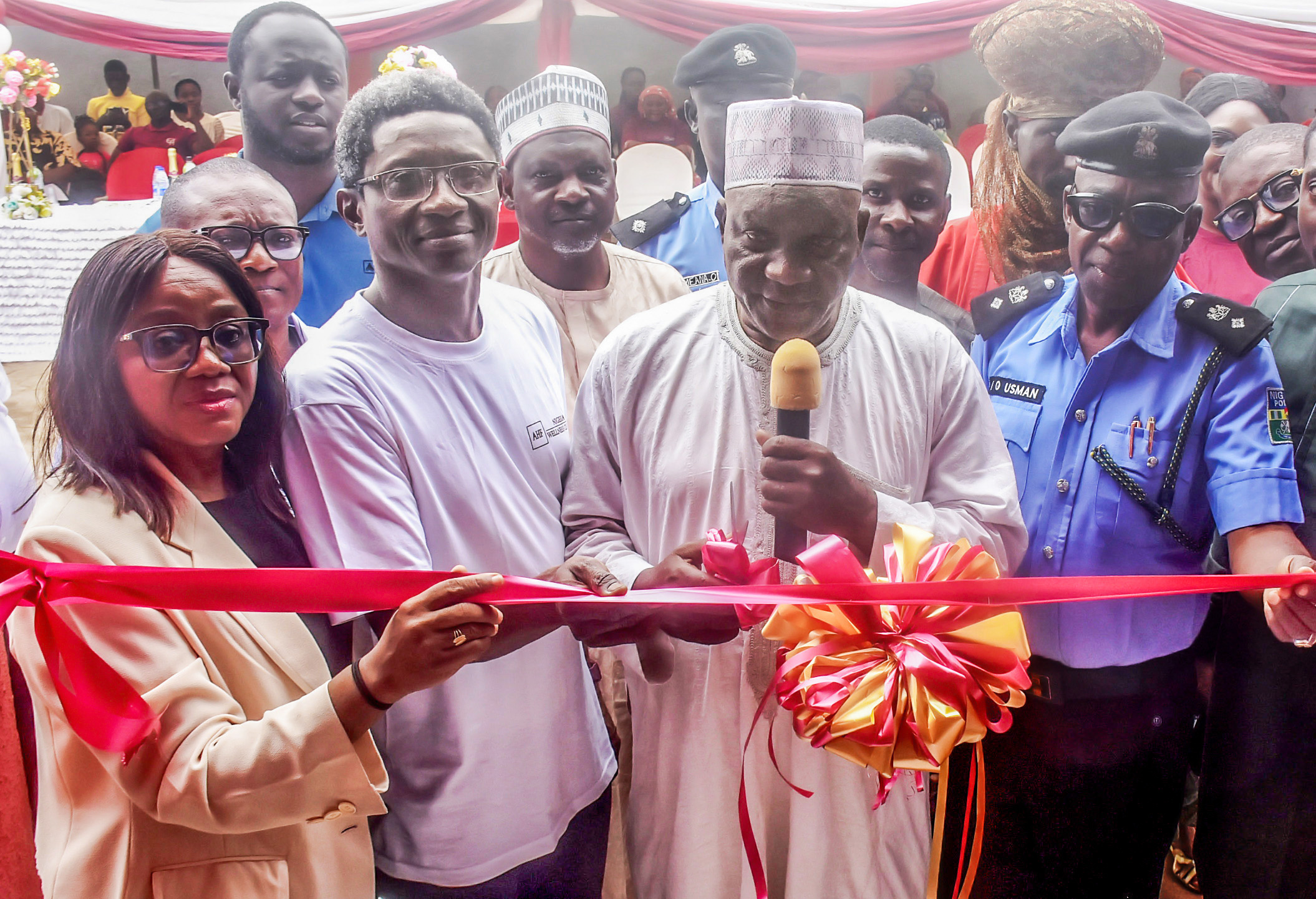 Pic.. Representative of the Gomo of Kuje, Alhaji Huseini Bako (M); Country Programme Director, AIDS Healthcare Foundation (AHF) Nigeria, Dr Echey Ijezie (2nd R); Programme Manager, FCT Agency for the Control of AIDS, Dr Doris John (3rd R); Divisional Police Officer (DPO) in charge of Kuje Police Division, Mr Usman Ibrahim-Obochi (R) and other dignitaries, during the inauguration of FCT Wellness Centre for free Sexually Transmitted Infections (STIs) Testing and Treatment by AHF Nigeria, in Abuja on Thursday (21/8/25).