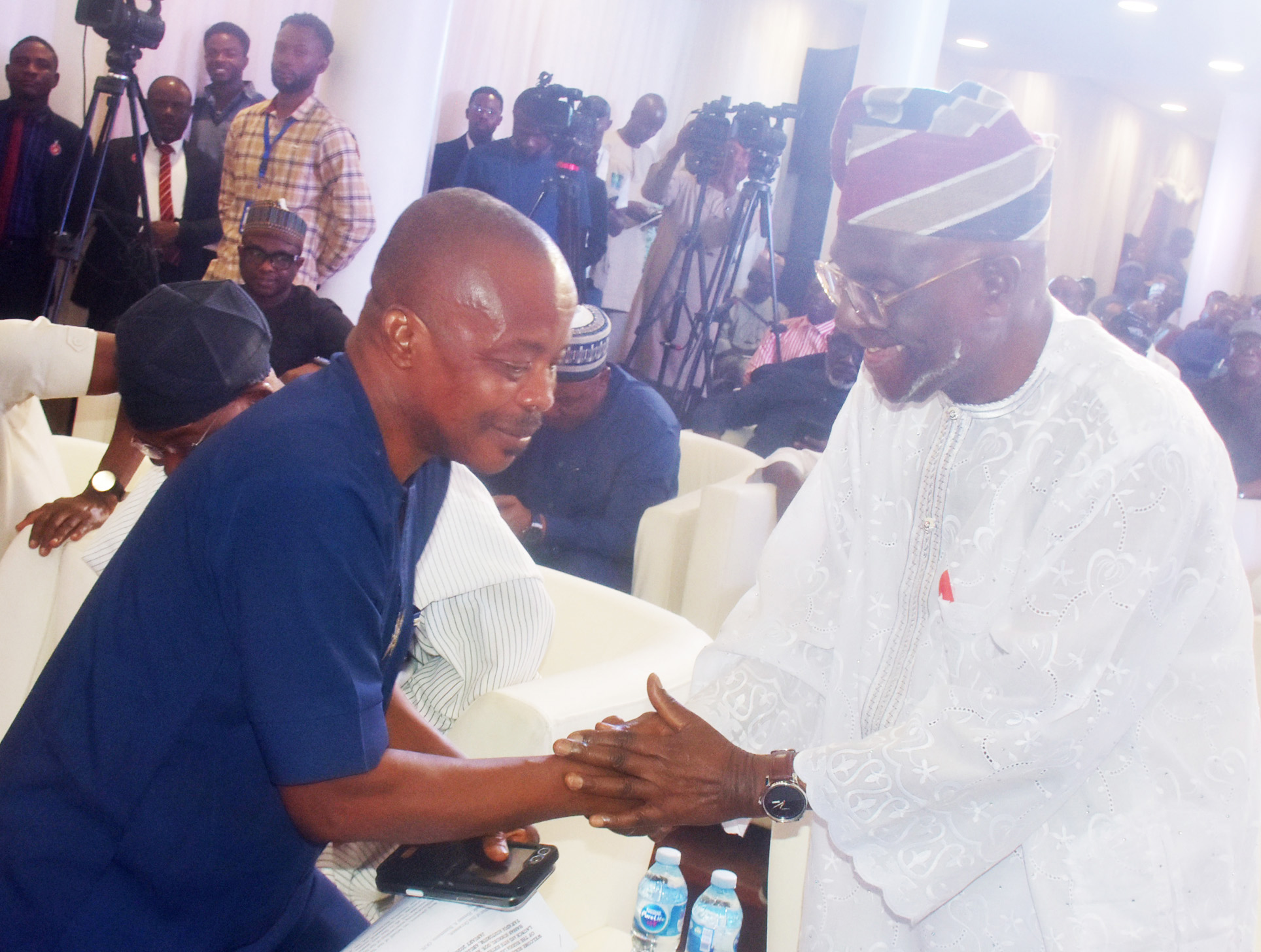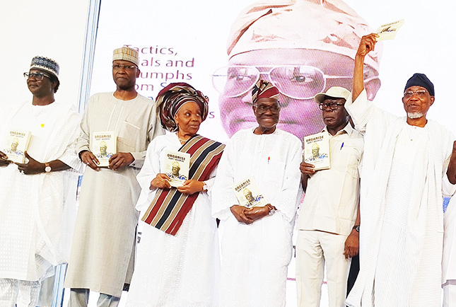 Pic.1. From left: Former President, Nigeria Labour Congress (NLC), Comrade Ayuba Wabba; former Secretary to the Government of the Federation, Mr Boss Mustapha; wife of the celebrant, Alhaja Wasilat Sunmonu; her husband and Author of the book, Comrade Hassan Sunmonu; Senator representing Edo North Senatorial District, Comrade Adams Oshiomhole and former Governor of Osun State and former Minister of Interior, Ogbeni Rauf Arebgesola, during the celebration of labour icon, Hassan Sunmonu, on his 85th birthday in Abuja on Wednesday