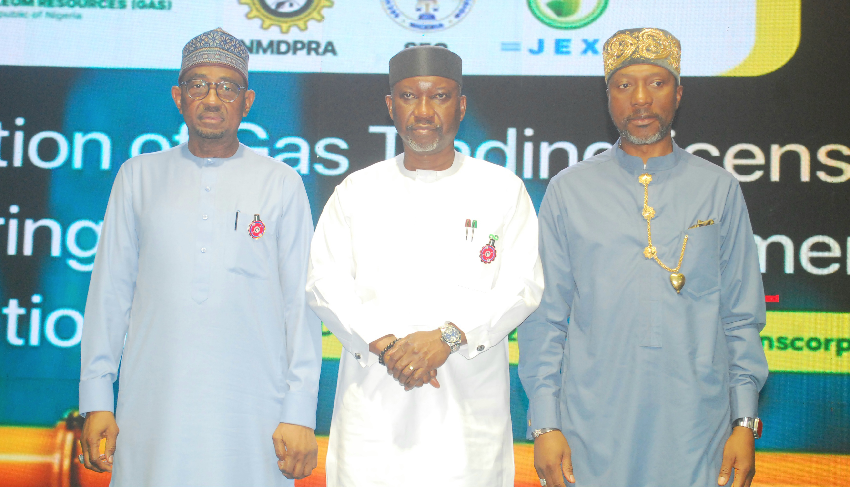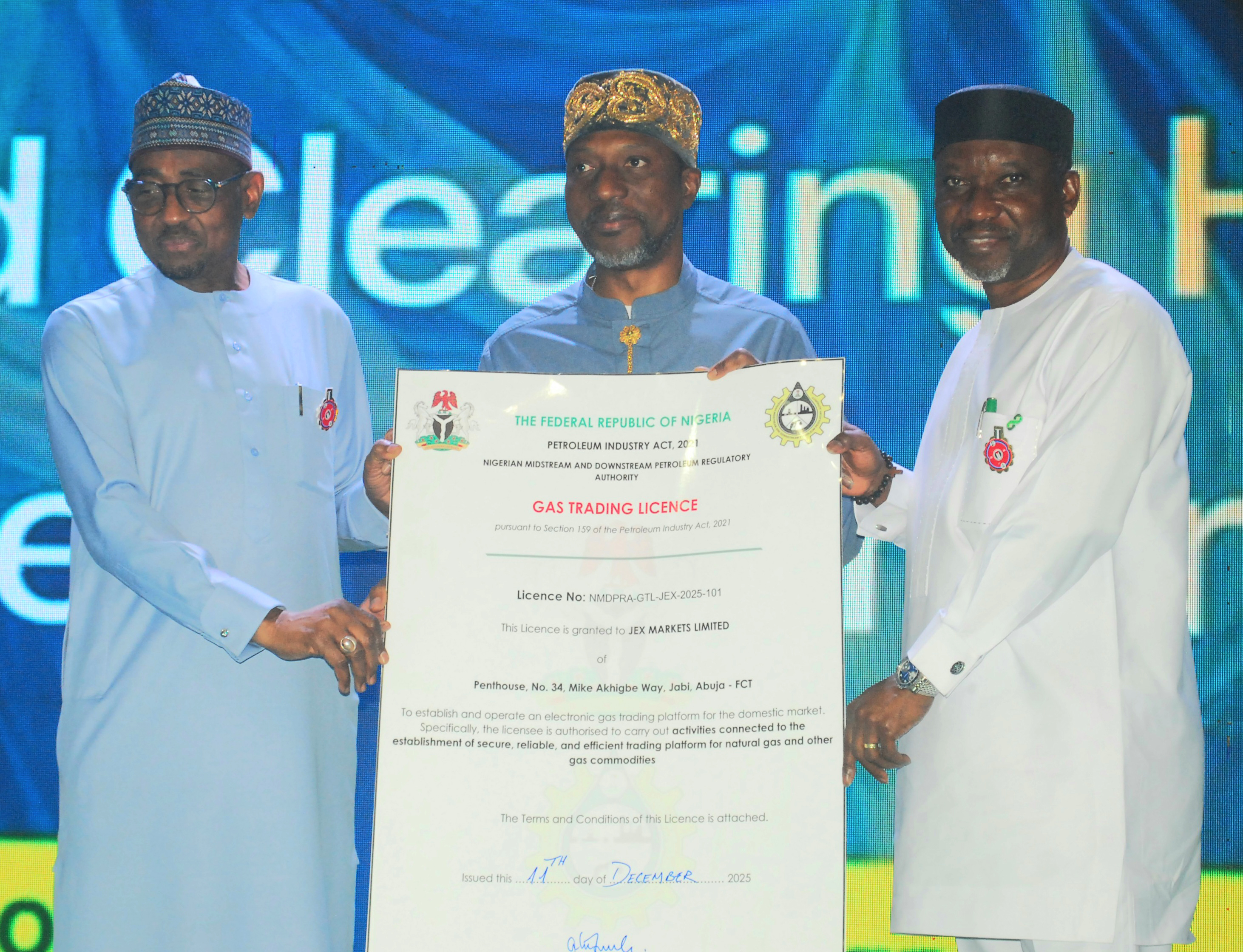 Pic.16. From left: Executive Director, Nigerian Midstream and Downstream Petroleum Regulatory Authority (NMDPRA), Farouk Ahmed; Minister of State for Petroleum Resources (Gas), Ekperikpe Ekpo and Chairman JEX Markets, Oscar Onyema, during the presentation of Gas trading license and clearing house and settlement authorisation in Abuja on Thursday (11/12/25).
