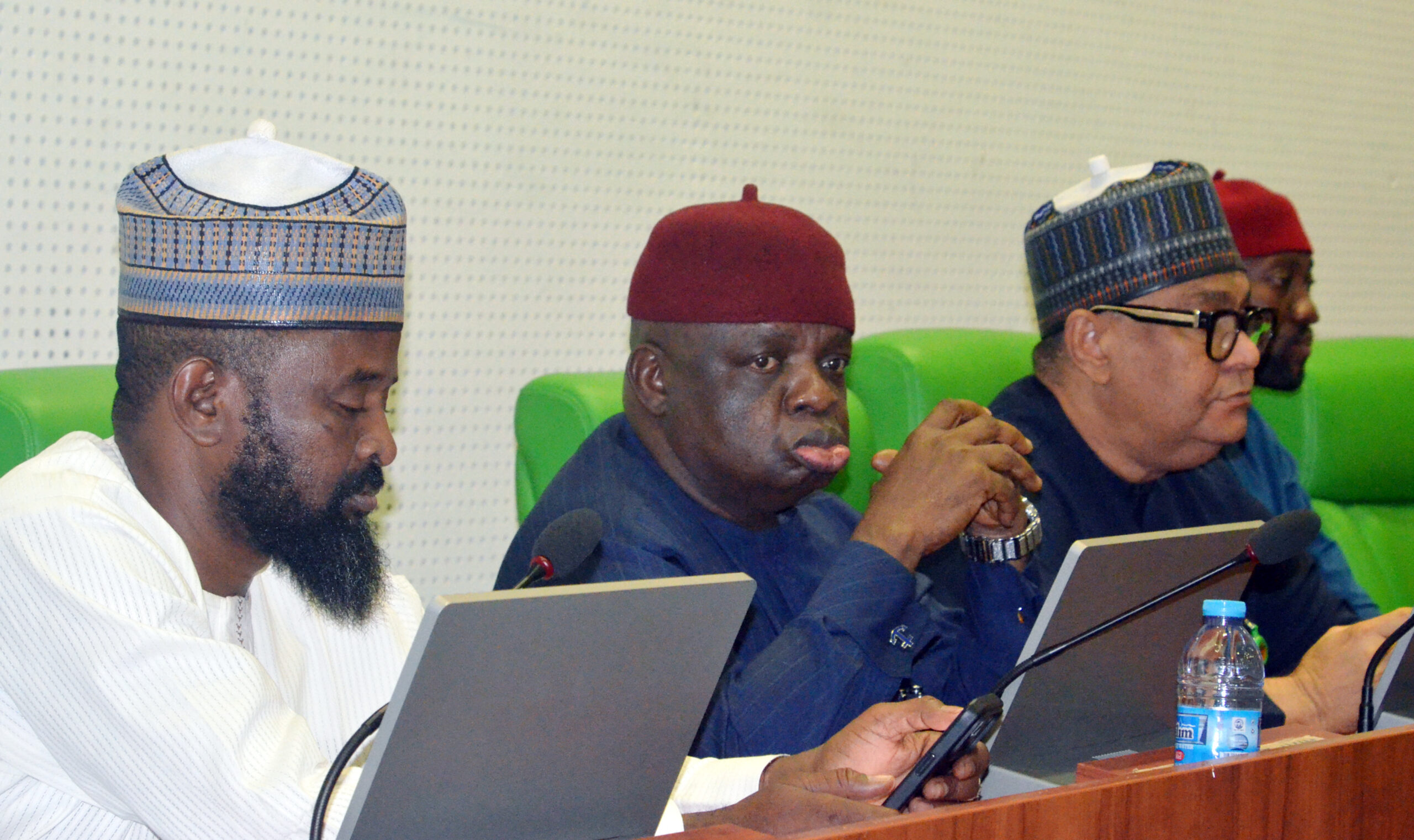 Pic.. From left: Chairman, House of Representatives Committee on Police Affairs, Rep. Makki Yalleman; House of Representatives Committee on Health Care Services, Rep. Alex Egbona and the Deputy Chairman, House of Representatives Committee on NELFUND, Rep. Emil Iyang, during the Committee on Appropriation’s 2025 budget assessment session with the Minister of Finance and Coordinating Minister of Economy; Minister of Budget and National Planning and the Chairman, Revenue Mobilisation Allocation and Fiscal Commission, at the National Assembly Complex in Abuja on Wednesday (25/2/26).