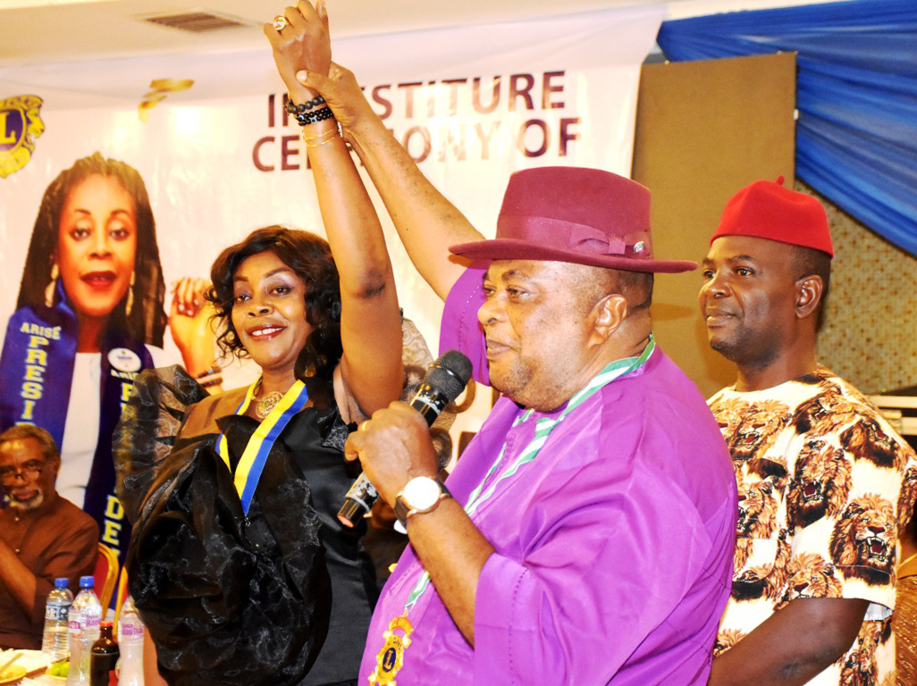Pic.4. From left: President, Enugu Metropolitan Lions Club (EMLC), Mrs Chibota Edozie; District, Governor Lions International District 404A2, Mr Ekeziel Umoh and Past President of EMLC, Chief Emmanuel Agbo, during the Investiture of Chibota as the 7th President of EMLC in Enugu on Wednesday (12/11/25).