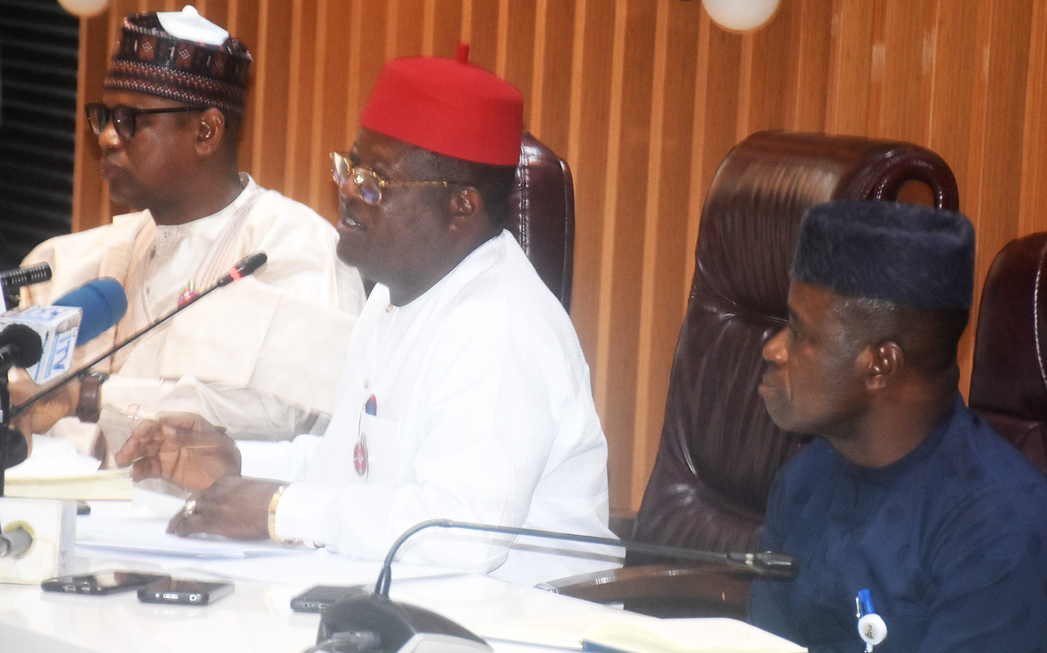 [caption id="attachment_7535" align="alignnone" width="300"] Pic.3. Minister of Works, David Umahi (L), briefing newsmen on the recent outcome of the ongoing...