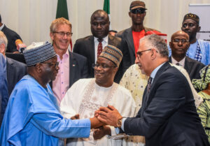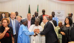 Pic. 3. Former Chief of staff to late former President Buhari, Prof Ibrahim Gambari (L); congratulating the Ambassador of Algeria to Nigeria, Amb. Hocine Mezoued (3rd R), during the celebration of Algeria National Day in Abuja. With them are: other government officials and members of the Diplomatic Community.
