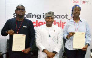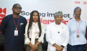 Pic.. From left: Secretary General, Follow The Money International, Mukhtar Halilu; Chief Operating Officer, Connected Development (CODE), Ijeoma Oforka; Chief Executive of CODE, Hamzat Lawal and the Head of Office/acting Chief Executing of CODE, Hyeladzira Mshelia, during a news conference to commemorate Lawal’s 13th years of impact at CODE and announcement of CODE’s acting leadership, in Abuja on Monday (1/9/25). 0002/MON/SEP/1/2025/Hogan Bassey/NANPic.. From left: Secretary General, Follow The Money International, Mukhtar Halilu; Chief Executive of Connected Development (CODE), Hamzat Lawal and the Head of Office/acting Chief Executing of CODE, Hyeladzira Mshelia, during a news conference to commemorate Lawal’s 13th years of impact at CODE and announcement of CODE’s acting leadership, in Abuja on Monday (1/9/25). MON/SEP/1/2025/Hogan Bassey/NANPic.. Head of Legal Service, Connected Development (CODE), Ada Mba (L) administering oath of office to the Head of Office/acting Chief Executing of CODE, Hyeladzira Mshelia, during a news conference to commemorate Lawal’s 13th years of impact at CODE and announcement of CODE’s acting leadership, in Abuja on Monday (1/9/25). With them is the Chief Executive of CODE, Hamzat Lawal (M). 0003/MON/SEP/1/2025/Hogan Bassey/NAN