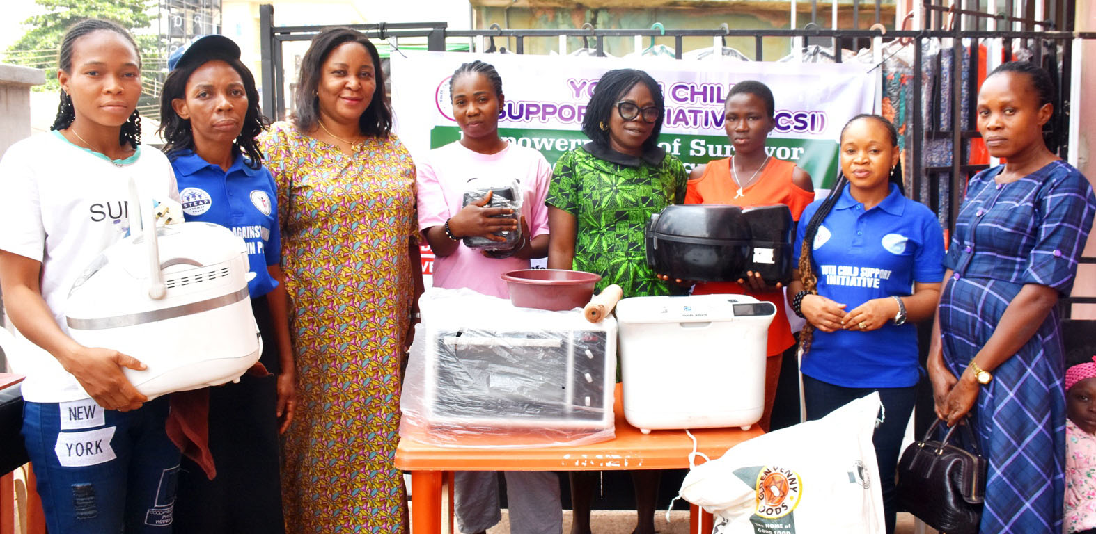 Pic.5.Zonal Coordinator, Refugee Commission Enugu, Ms Gloria Ene (2nd L); representative of Network of Civil Society Organizations Against Child Trafficking, Abuse and Labour, Dr Ifeoma Enyinnayaigwe (3rd L); representative of Youth Child and Support Initiative, Ms Chiamaka Nwobodo (5th L): representative of Children on the Move Support and Protection Network Nigeria, Ms Promise Chika, (7th L); representative of National Agency for the Prohibition of Trafficking in Persons, Ms Gloria Odenenam (R) with some beneficiaries, during the presentation of working equipment, appliances and empowerment to survivors of modern day slavery with support from Freedom Fund in Enugu on Thursday (26/2/26). 0432/THURS/FEB/25/2026/Mike Agada/NAN