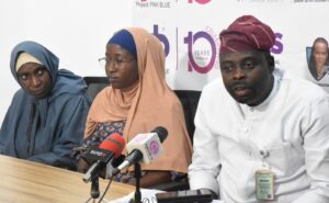 Health Communication Associate, Project Pink Blue, Faridah Banwo; National President, Hospital and Palliative Car Association of Nigeria, Prof. Tonia Onyeka; and the Cervical Cancer Survivor, Ivey Umeh, during a news conference on Dicey Scroggins Patient Advocacy Fellowship program for the cancers survival patients from various States organised by Project PINK BLUE-Health in collaboration with Psychological Trust Centre in Abuja.