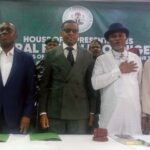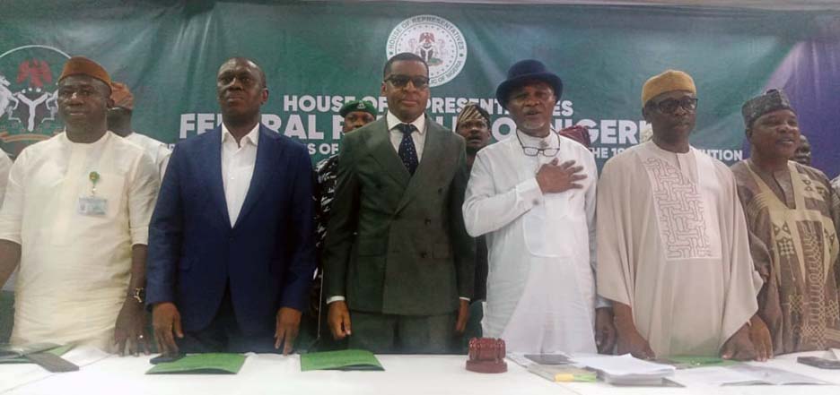 Pic.. From left: Members House of Representatives Sub-Committee on the Review of the 1999 Constitution of the Federal Republic of Nigeria, Rep. Mark Esset; Rep. Bob Solomon; representative of the Governor/Deputy Governor of Cross River, Mr Peter Odey; House of Representative Minority Leader/Chairman of the Sub-Committee, Rep. Kingsley Chinda; Deputy Chairman of the Sub-Committee, Rep. Godwin Offiono and the Deputy Leader, House of Representatives, Rep. Abdullah Halims, during the public hearing and submission of compendiums at the South-South, Center-B, in Calabar at the weekend